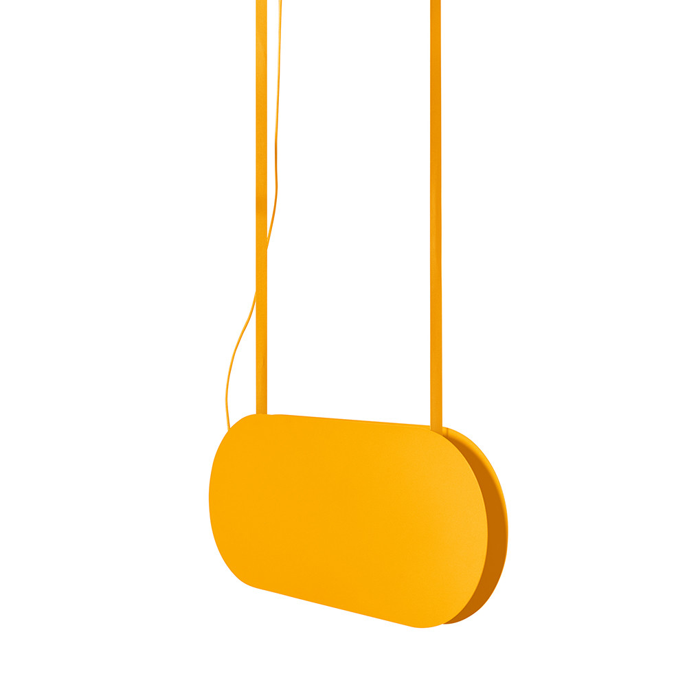 Die Leuchte ist an einem farblich auf den Korpus abgestimmten Textilband aufgehängt und 145 cm lang. Mit ihrer horizontalen Form und ihren Proportionen (80 x 5,2 x 35 cm) passt sie perfekt über eine Kücheninsel, eine Bar oder einen Tisch und bringt nicht nur Licht, sondern auch Charakter in den Raum.
