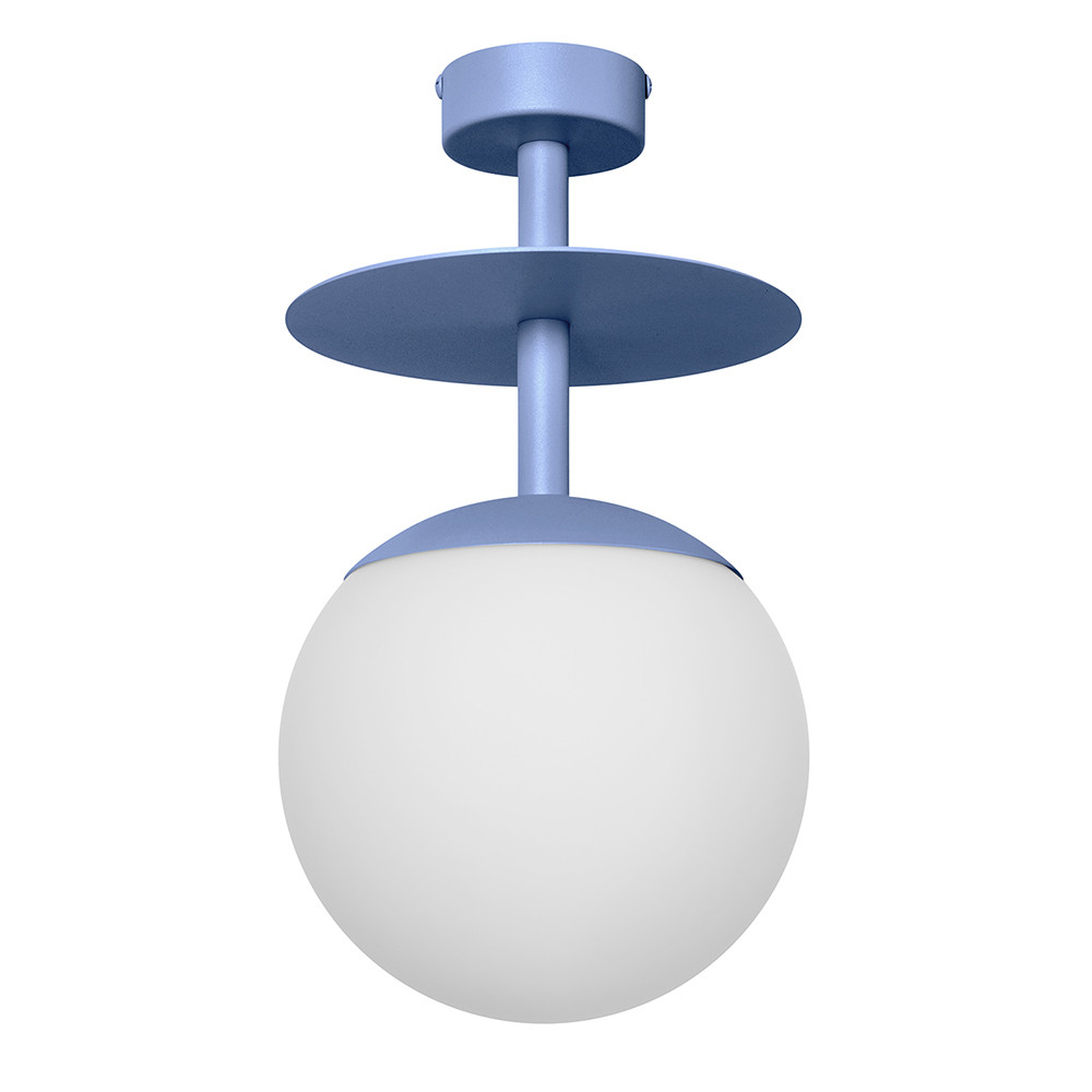 -Deckenleuchte - Material Metall, Glas - Farbe blau (Pigeon Blue RAL 5014) - Höhe 37cm - Durchmesser 20cm - Glasdiffusor matt weiß fi 20cm - Deckeneinfassung lackiert strukturell blau fi 8cm - Metallscheibe fi 20cm - zweiadriges Kabel 2 X 0.75mm2 - Gewinde E27 - max 15W - IP20