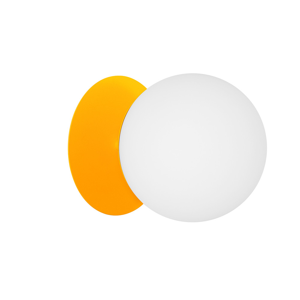 - Wandleuchte, Wandhalterung, Plafond - Material Metall, Glas - Farbe Melone (Melon Yellow RAL 1028) - Länge 26,6cm - Breite 20cm - Höhe 20cm - Lampenschirm aus mattiertem weißem Glas fi 20cm - strukturelle melonfarbig lackierte Wandhalterung fi 14cm - Metallscheibe fi 20cm - zweiadriges Kabel 2 X 0.75mm2 - Gewinde E27 - max 15W - IP44