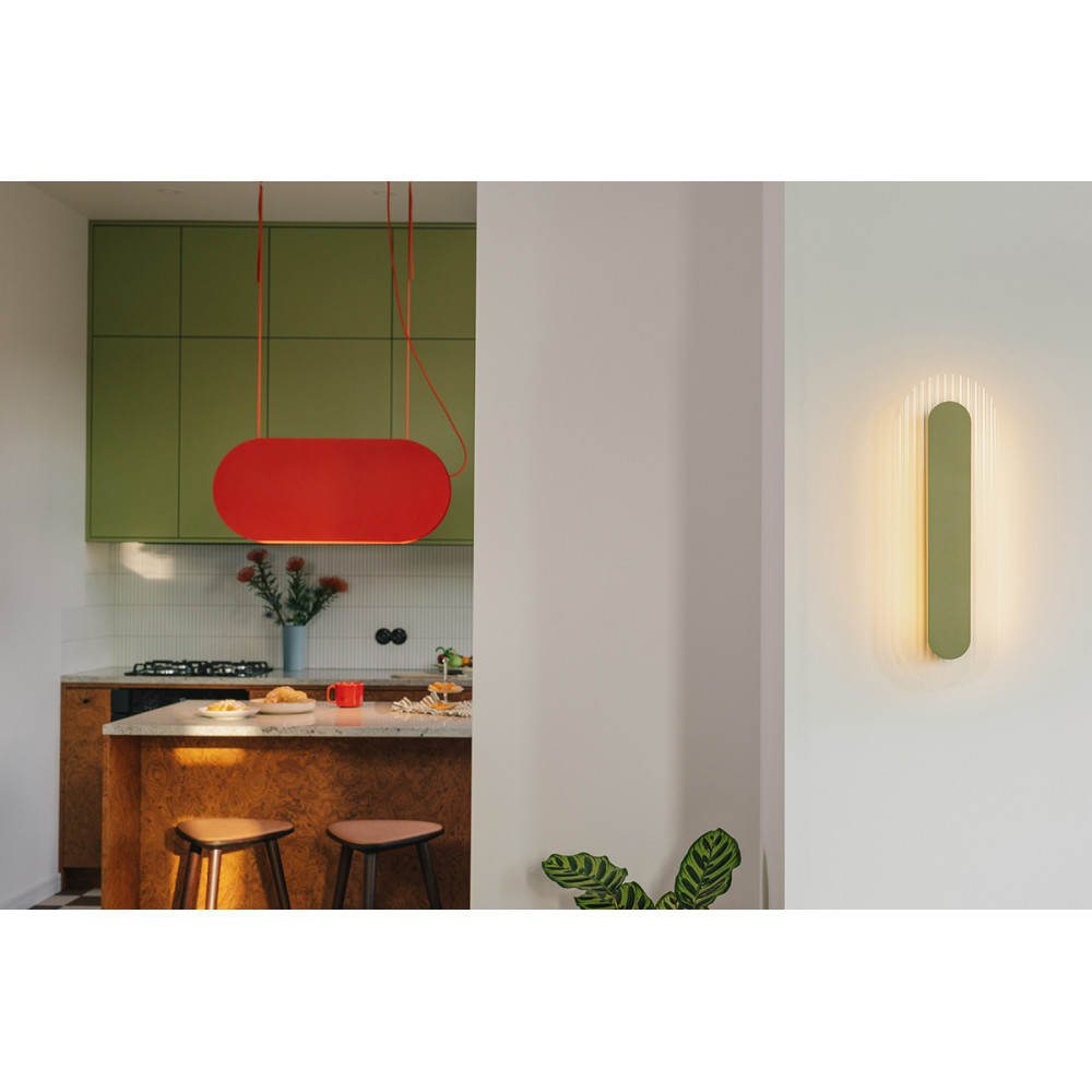 Der Leuchtenkörper besteht aus pulverbeschichtetem Metall in RAL 6013 olivgrün, RAL 9003 weiß oder RAL 9005 schwarz, was seine minimalistische, aber moderne Form unterstreicht. Die Front besteht aus strukturiertem Glas - transparent, aber geriffelt, was das Licht mit einem subtilen, diffusen Charakter in den Innenraum bringt.