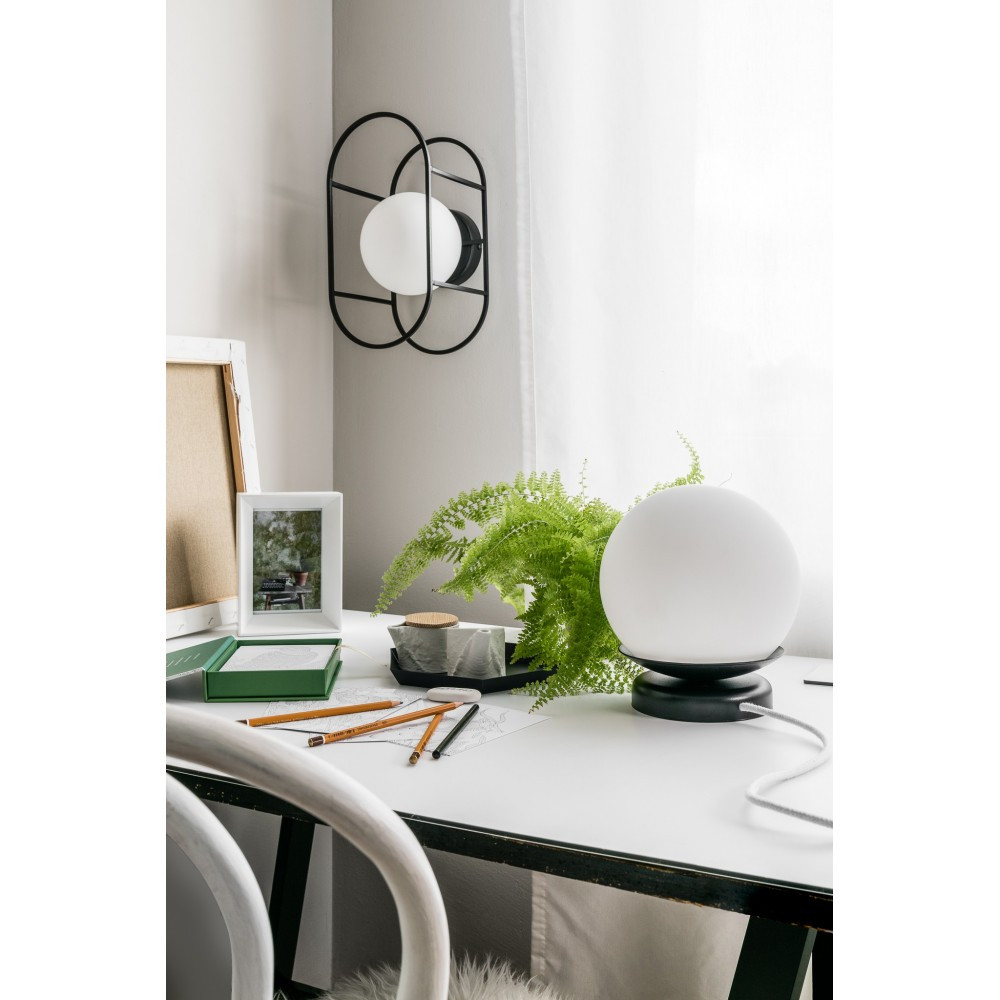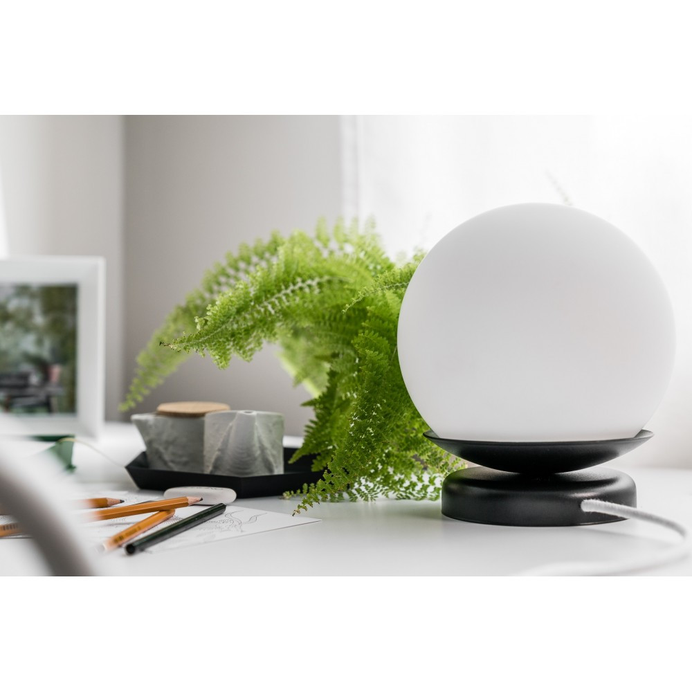 Im Vordergrund steht der Lampenschirm - eine klassische Glaskugel mit einem Durchmesser von 20 cm in milchigem Finish, die auf einem niedrigen Metallsockel ruht. Dank ihrer schlanken Proportionen gewinnt die Leuchte an optischer Leichtigkeit und bleibt dabei stabil und praktisch.